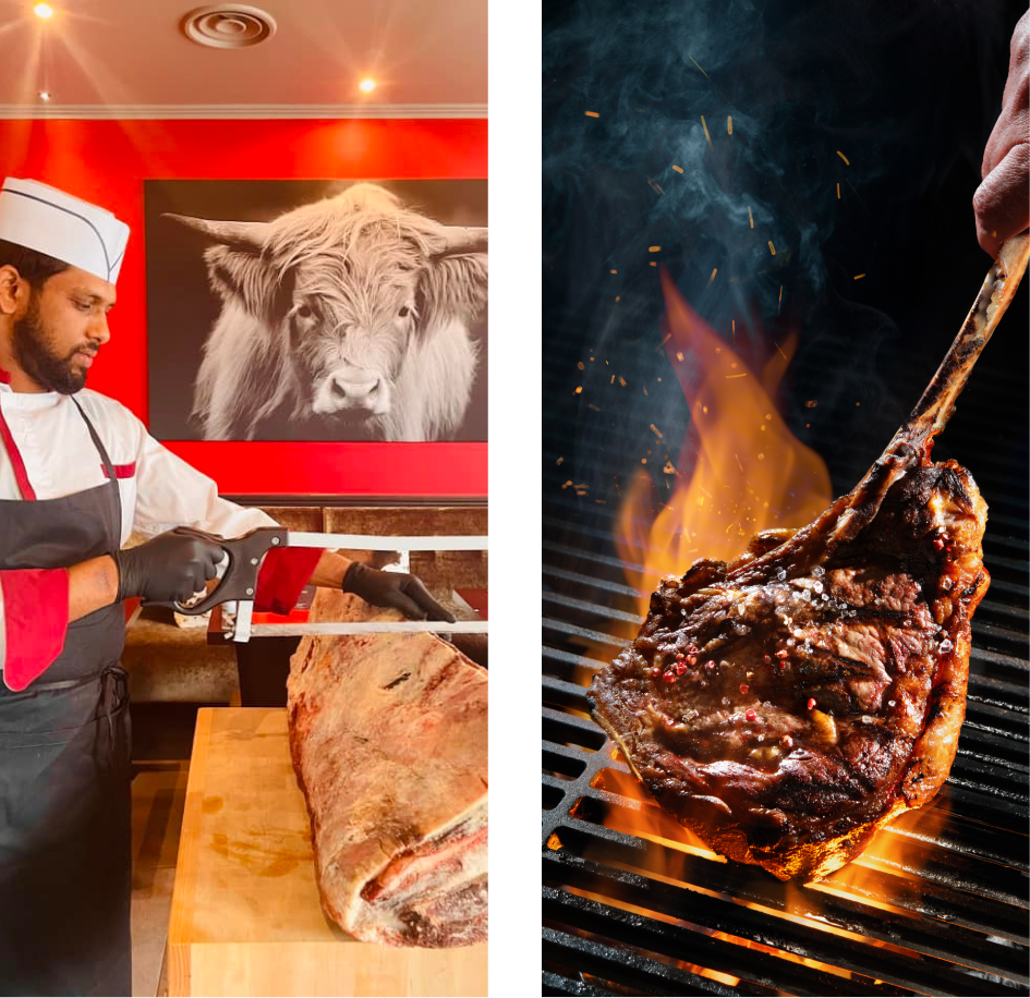 Côte, Tomahawk, L-Bone, Entrecôte, Flat Iron… Nos bouchers taillent dans l’excellence. Chaque pièce, grillée sur charbon de bois, exprime sa finesse. Une cuisson juste, une chair fondante, un plaisir authentique né du feu et du goût.
